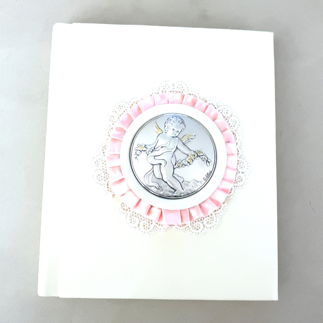 Сорренди ла твоя девочка с этим элегантным альбомом в белой белой панне, впечатляющим с изящным центральным декором в серебре 925 года и романтическим колокольчиком.