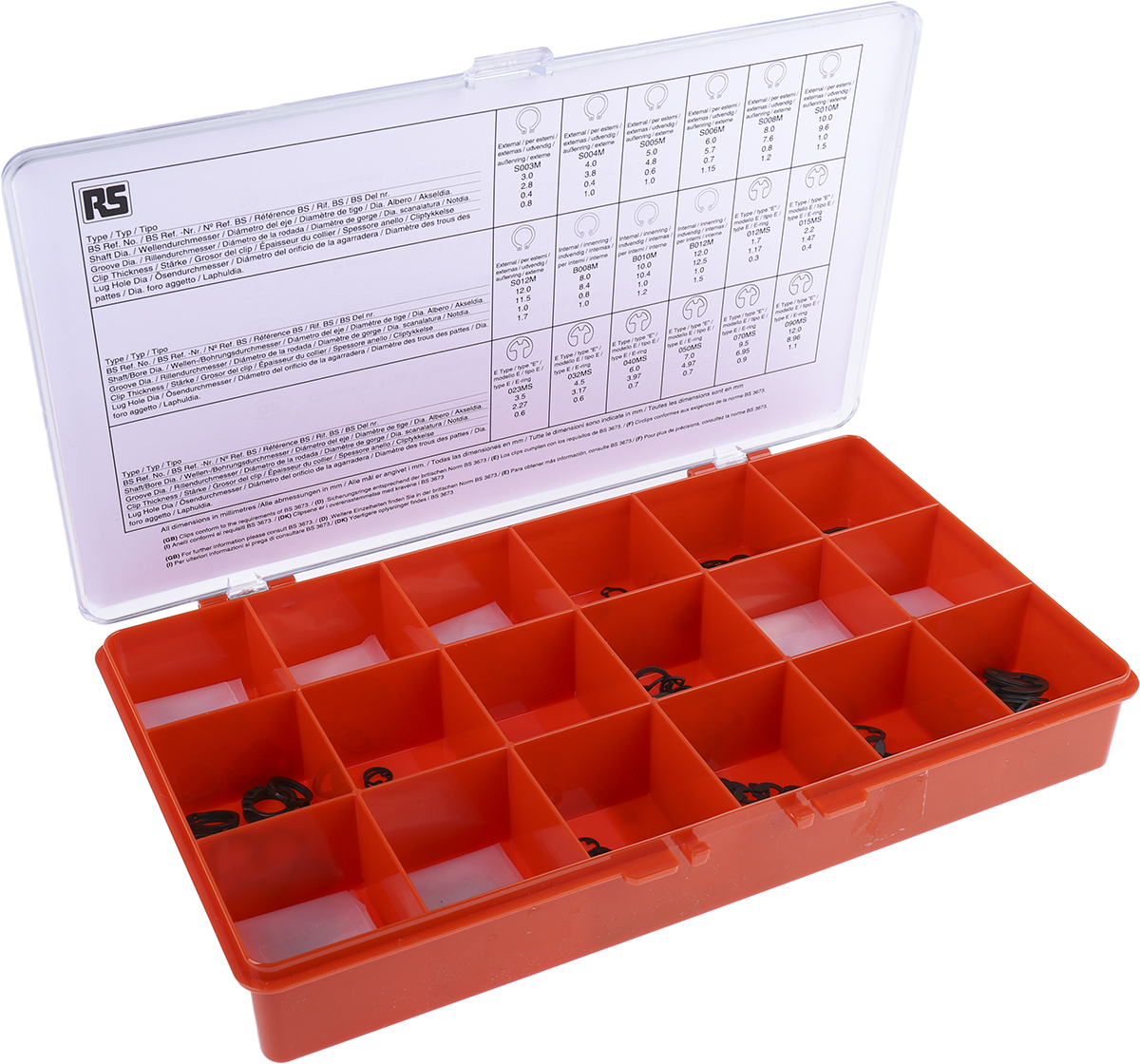 Kit anelli elastici Tipo E, Esterno, Interno RS PRO, 890 pezzi, in Acciaio, Ø albero 1.7 → 12 mm, 3 → 12