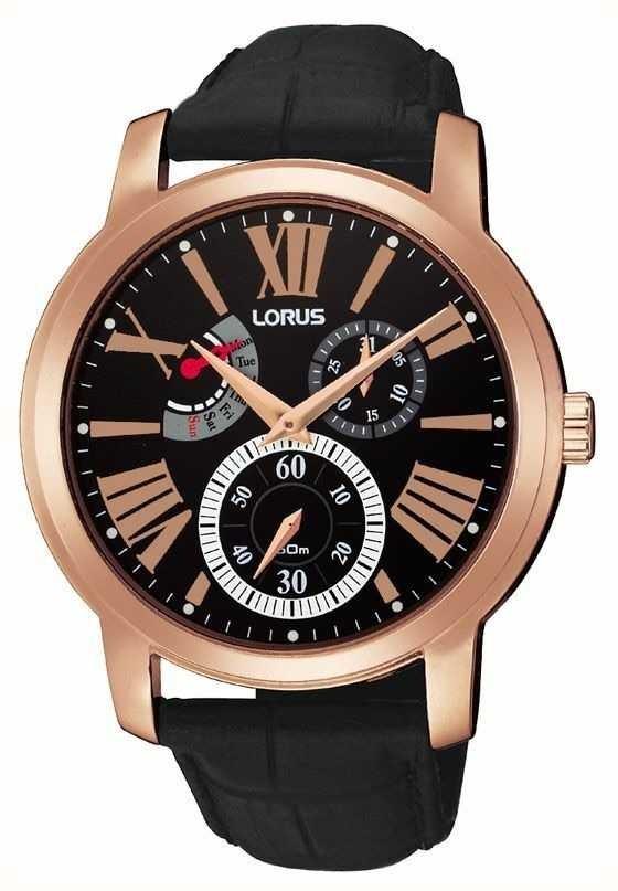 Мужские часы Lorus Only Time, мужской хронограф черного и золотого цвета, корпус из золотой стали, черный кожаный ремешок, черный циферблат RP822AX9