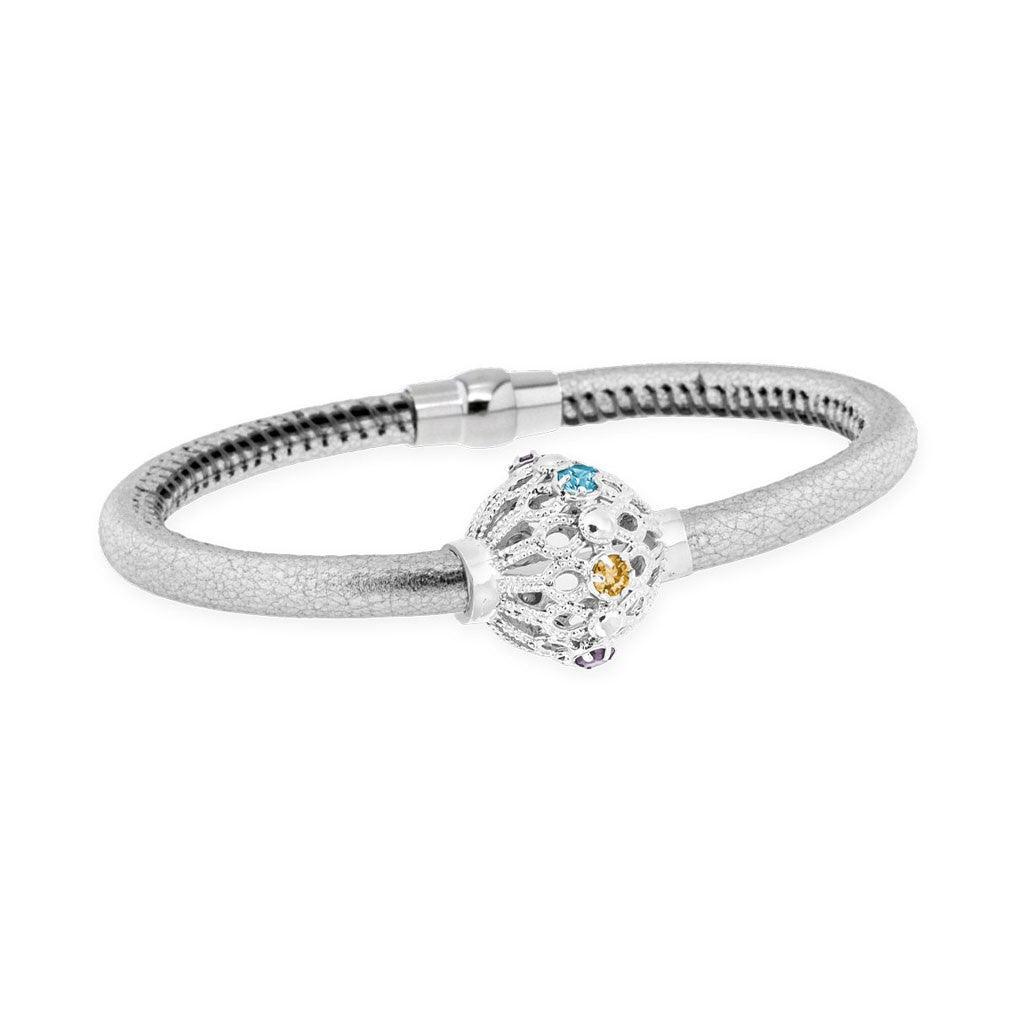 Michele Affidito Gioielli, женский браслет из искусственной кожи серебряного цвета с серебряными сферами 925 пробы, многоцветными гранеными камнями циркония круглой огранки, металлической застежкой серебряного цвета, коллекция Le Gioie. Браслет ручной работы линии Le Gioie содержит ажурную полую сферу. Драгоценность, вдохновленная драгоценным моментом, дарящим радость тем, кто его получает. Радость… чувство полного и живого удовлетворения души, делающее нас счастливыми. BR-GI-000206