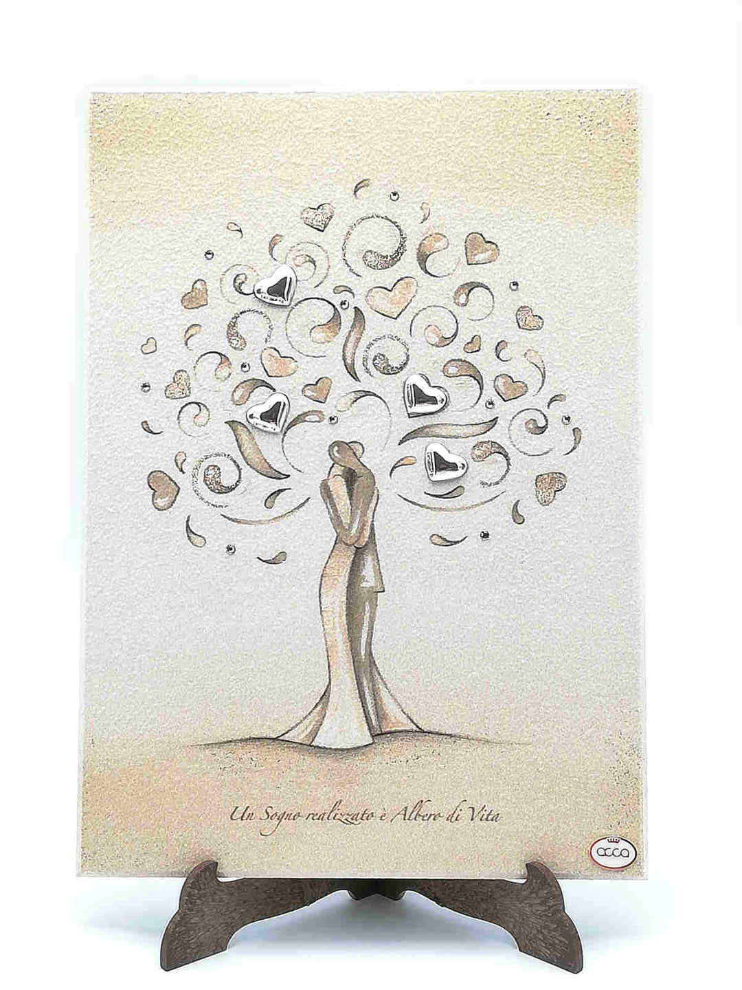 Четыре простых и серебряных приложения в 925 формах, восстановленных в цвете жизни с копиями, украшенными кристаллами Сваровски, с ретро-цветами. В фондо аль квадро есть фраза «Un sogno realizzato è albero di vita».