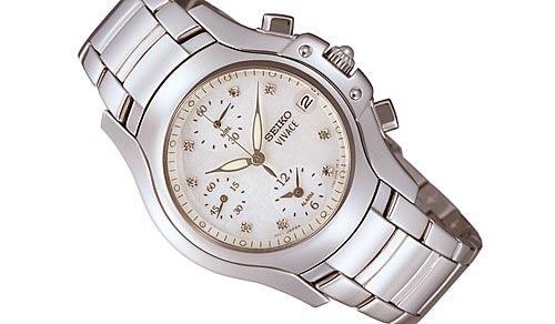 Часы Seiko, коллекция Vivace, хронограф со стальным корпусом и перламутровым циферблатом с 8 бриллиантами, защищенным устойчивым к царапинам и антибликовым стеклом, со стрелками для индикации часов, минут и секунд, тремя счетчиками и указателем даты в положении «3 часа», кварцевый механизм калибра 7T62, водонепроницаемость 5 атм SNA897P1